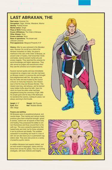 The Last Abraxan is a tribute to the artists of the 70s that blew my mind with their exotic vistas and alien locales. Artists like Jim Starlin, John Byrne, Terry Austin, John Buscema, Joe Sinnott, George Perez, Neal Adams, Frank Brunner, Michael Golden, Rick Buckler, Al Milgrom, Howard Chaykin, Keith Pollard, Gene Day , Klaus Janson, Dave Cockrum, John Romita (SR & JR), Bob Layton, Gil Kane, Herb Trimpe, Gene Colon and the man who invented cosmic, Jack Kirby