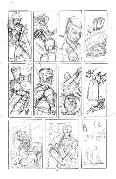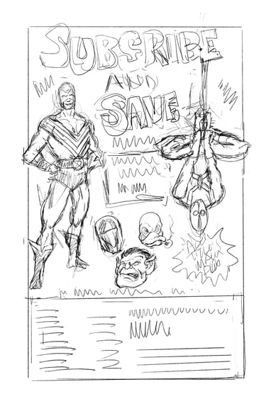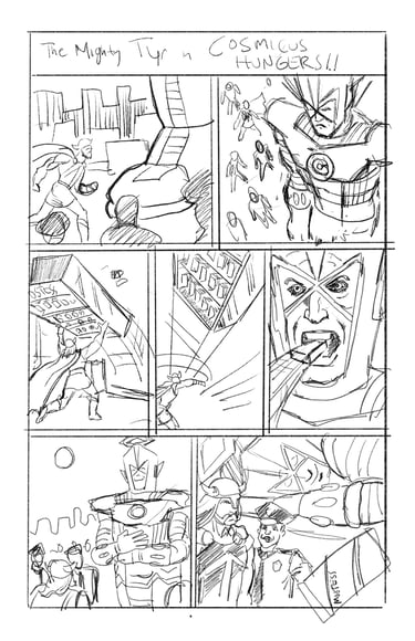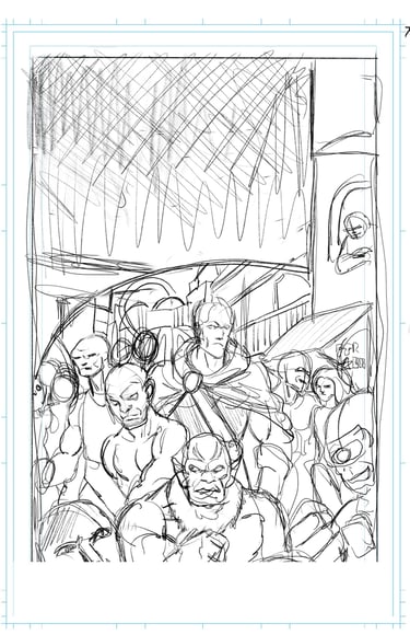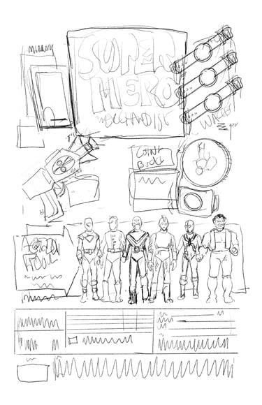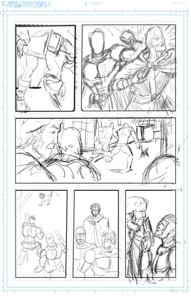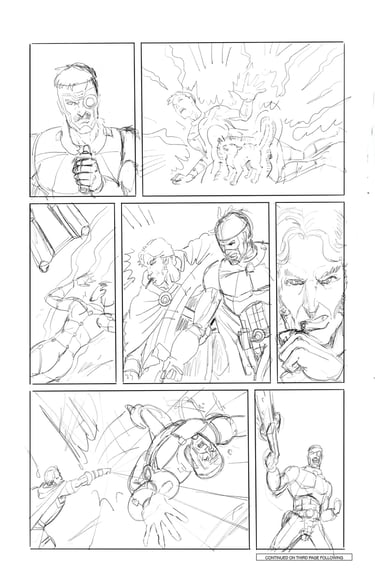 With the layouts and ad examples complete, the next step was to do what are called the "breakdowns" for each page. Breakdowns in comic art can range from simple, loose sketches showing the composition of each page and panel to tighter renders that indicate figures and backgrounds, but without shading, texture, or detail (those would often be added by the inker later on). For me, they would be somewhere in between—enough detail to see the relationships between figures, background elements, expressions, and some amount of costume detail, but not enough to go directly to ink. These served as the underdrawing for the final pencils. This is both the hardest and the most rewarding part of the process. It's pure storytelling. It's where the story really takes shape.