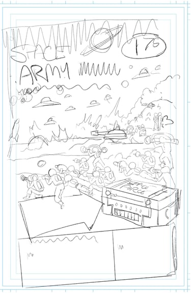 I did these not just for the comic pages, but for the other pages I would need to illustrate, such as the merchandise ad, subscription ad, Hostess ad, and toy soldier ad.