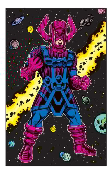 Fast forward to 2007. The superhero movie had begun its ascent into dominance as other sci-fi and fantasy franchises were waning. I was thinking about the upcoming Fantastic Four: Rise of the Silver Surfer movie. The Fantastic Four is my favorite comic, and I admit to having a fondness for the FF movies, even though they lacked the cosmic scale of the comics—comics that INVENTED the Marvel Cosmic style that I love so dearly. The movie would give us a Galactus that was a malevolent cloud, rather than the armored giant with a purple tuning-fork helmet. I decided that if they weren’t going to give me that Galactus, I would just make my own. I proceeded to do a rough pencil drawing (in my best John Byrne/John Buscema style) of Galactus. It wasn’t bad. I had recently bought my very first expensive sable-hair watercolor brush (I was primarily a pen inker) and inked the drawing. The results also weren’t bad. I decided to scan and color it as well.