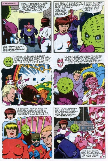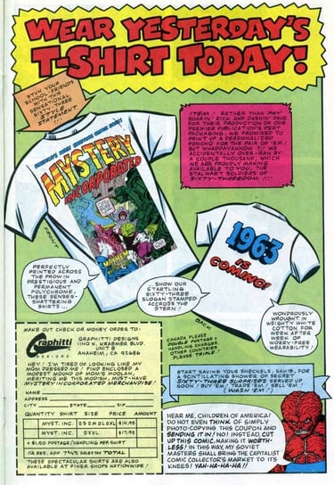 I could still keep everything else stylistically the same. It could still be done in a retro style as a fake old comic. There were several examples of this (and many more would follow). Most notably, Image Comics’ 1963, created by Alan Moore, Steve Bissette, John Totleben, Rick Veitch, Dave Gibbons, and others, was a wonderful tribute to the early Marvel Comics of their formative years. It was a very faithful version of a comic from that era, printed on newsprint and mimicking the halftone screens of old letterpress color separations rather than the finer dot screens used in comics at the time. It even featured ads and editorial content for a fictional 1960s Image Comics that never existed.