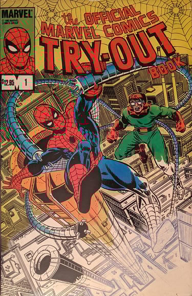 The initial plan was to finish the Marvel Try-Out Book. Released by Marvel in 1984, it featured a Spider-Man story with pages at various stages of completion, printed on professional Bristol board in blue line. It provided pages to pencil, ink, color, letter, script, and plot, along with simple instructions on the process. It was an amazing resource for many young comic artists, and they even held a contest with winners like Mark Bagley and Doug Hazelwood, who would go on to have very successful comic careers. Many aspiring creators have used the book over the years, and you can find samples of their art online if you hunt around. I owned a couple of copies of the book over the years and did many of the pages as samples. I figured I would complete it in a very period-appropriate way, with simple colors, no bleeds, thought balloons, captions, etc. I would post one page at a time, starting with the first few pages completed by the creative team. I would then complete a page, starting with the coloring section, then the inking section (which I would also color), and so on. I thought I could even take the cover and redress it as an Amazing Spider-Man Annual from 1984/85. I could include scans of the actual ad pages from an annual for that year, making the whole thing look like a complete artifact from an alternate dimension, much like my black-and-white 80s comic.