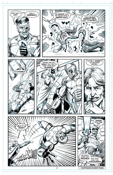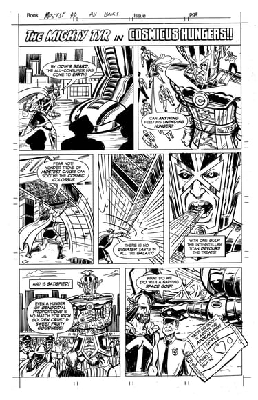 Once the script and lettering were complete, I moved on to the inking. Originally, I planned a digital/analog hybrid for the inks. I really love inking with pen and brush, and I also wanted some physical pages to show. My plan was to ink the backgrounds and other elements digitally, then print the pages on Bristol board with the underlying pencils as blue lines. That way, I could ink the remaining areas traditionally. I did this for the cover and for the Hostess, Heroes World, subscription, and toy soldier ads. However, this process was time-consuming, so for the actual story pages, I decided to ink most of the page digitally, leaving one panel and a few key figures to be inked by hand. I did this for most of the first half of the book, but it was still quite time-consuming (plus, some eye issues were making it harder to draw, and being able to zoom in digitally made things easier until the problem was corrected).