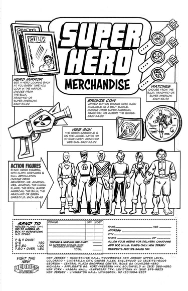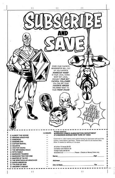 To give it an even more old-fashioned feel, I decided to letter the book before inking it, so I wouldn’t have to ink the areas covered by text. I actually wrote the first draft of the script while lettering it, adjusting the copy to fit the available space as needed. The lettering was done digitally, but using Adobe Illustrator on a computer. After some research, I found a font that closely resembled the work of Tom Orzechowski, who lettered much of the Starlin Warlock series, along with a great deal of iconic '70s comics like Uncanny X-Men. For the merch ad, I used a font inspired by artist Joe Kubert’s lettering, since the Kubert School created many of the old Heroes World merchandise ads I was emulating.