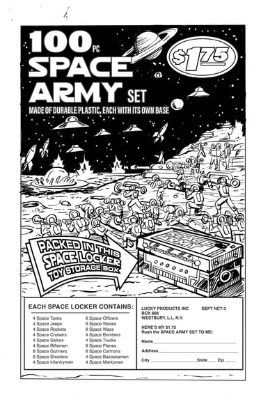 Eventually, I switched to fully digital inks for the second half of the book, including all the spot illustrations and corner boxes. I still printed out all the pages on Bristol board with the blue lines visible, to simulate art boards for display. The cover and full-page illustrated ads (merchandise, subscription, Hostess, and Space Army) were scanned from those boards, including the lettering.