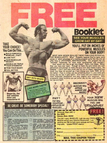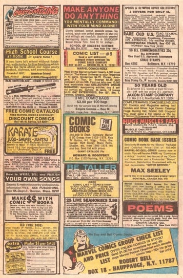 This turned out to be a fascinating exercise. Although I had seen those ads for decades, I had never taken such a deep dive. I hadn’t realized that some ads consistently appeared on the same pages month after month, year after year. I also paid attention to the variety of things being advertised—martial arts, bodybuilding, trades to learn, and skills to acquire. All promised to help you better yourself, earn more money, and become more successful with women. In many ways, the ads were targeted at young men with self-esteem issues, much like the brightly colored power fantasies of the comics themselves.