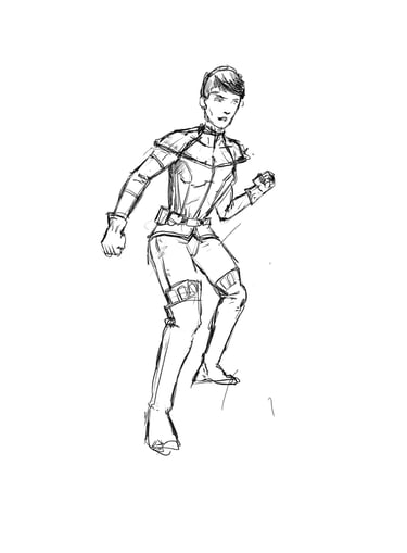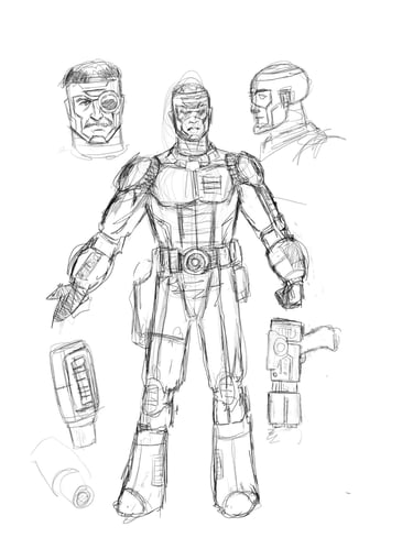 I also started designing the characters. This came pretty quickly. Again, I was pretending to be under tight deadline pressure, so I often went with my first instincts. Most designs were pretty much locked in with the first or second sketches. I also created some sample images of the characters against simple backgrounds. I used these to test the coloring and inking styles, as well as to mock up ideas for cover design or pin-ups. I was satisfied with the look of everything, so now it was time to put it all together.